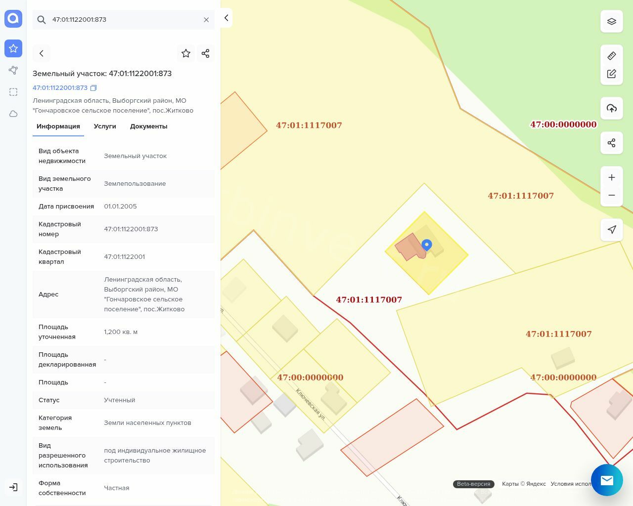 Земельный участок, общей площадью 1200 +/- 24 кв. м, с кадастровым номером 47:01:1122001:873,