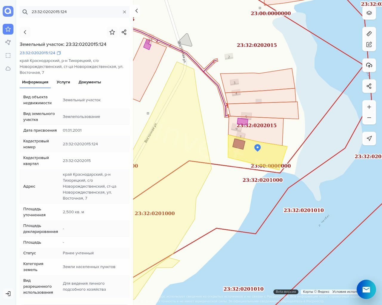 Земельный участок, Кадастровый номер: 23:32:0202015:124 Категория земель: Земли населенных пунктов. Виды разрешенного использования объекта недвижимости: Для ведения личного подсобного хозяйства. Площадь: 2500 +/- 18 кв.м. Вид права, доля в праве: Собственность. Адрес: край Краснодарский, р-н Тихорецкий, с/о Новорождественский, ст-ца Новорождественская, ул. Восточная, 7