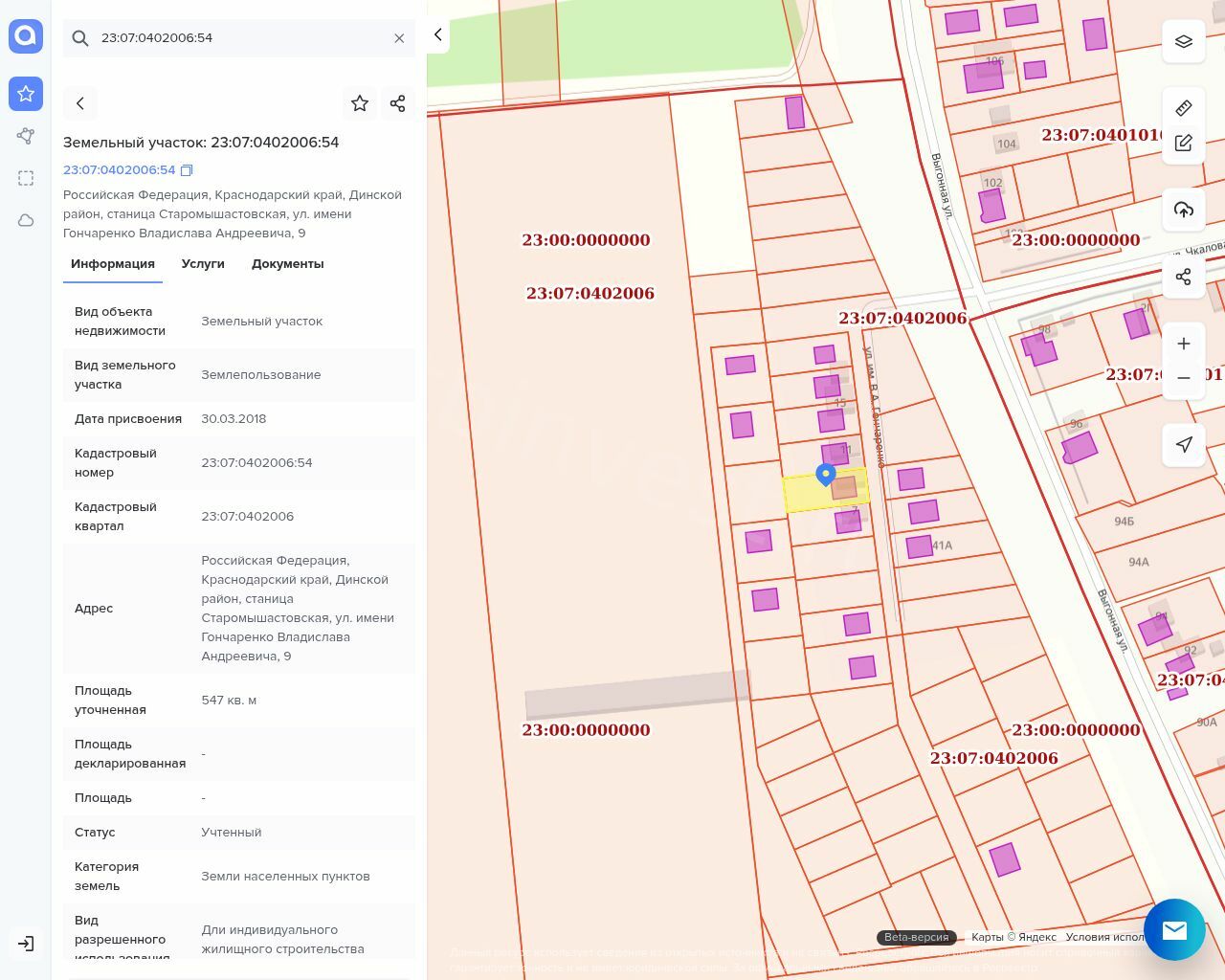 Земельный участок, площадью 547,0 кв.м., кадастровый номер: 23:07:0402006:54, категория земель: земли населенных пунктов, вид разрешенного использования: дли индивидуального жилищного строительства