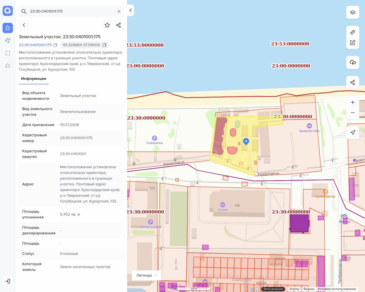 -земли населенных пунктов, разрешенное использование - для эксплуатации базы отдыха, кад. № 23:30:0401001:175, площадь 5452 +/- 1292 м2. В