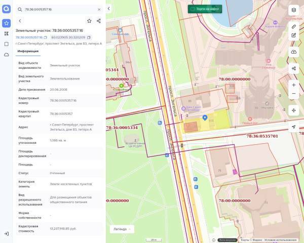 Земельный участок кадастровый номер участка 78:36:0005357:16, площадь земельного участка 1 086,0 кв.м., категория земель - земли населенных пунктов, разрешенное использование (назначение) для размещения объектов общественного питания стоимостью 32 637 600 руб.