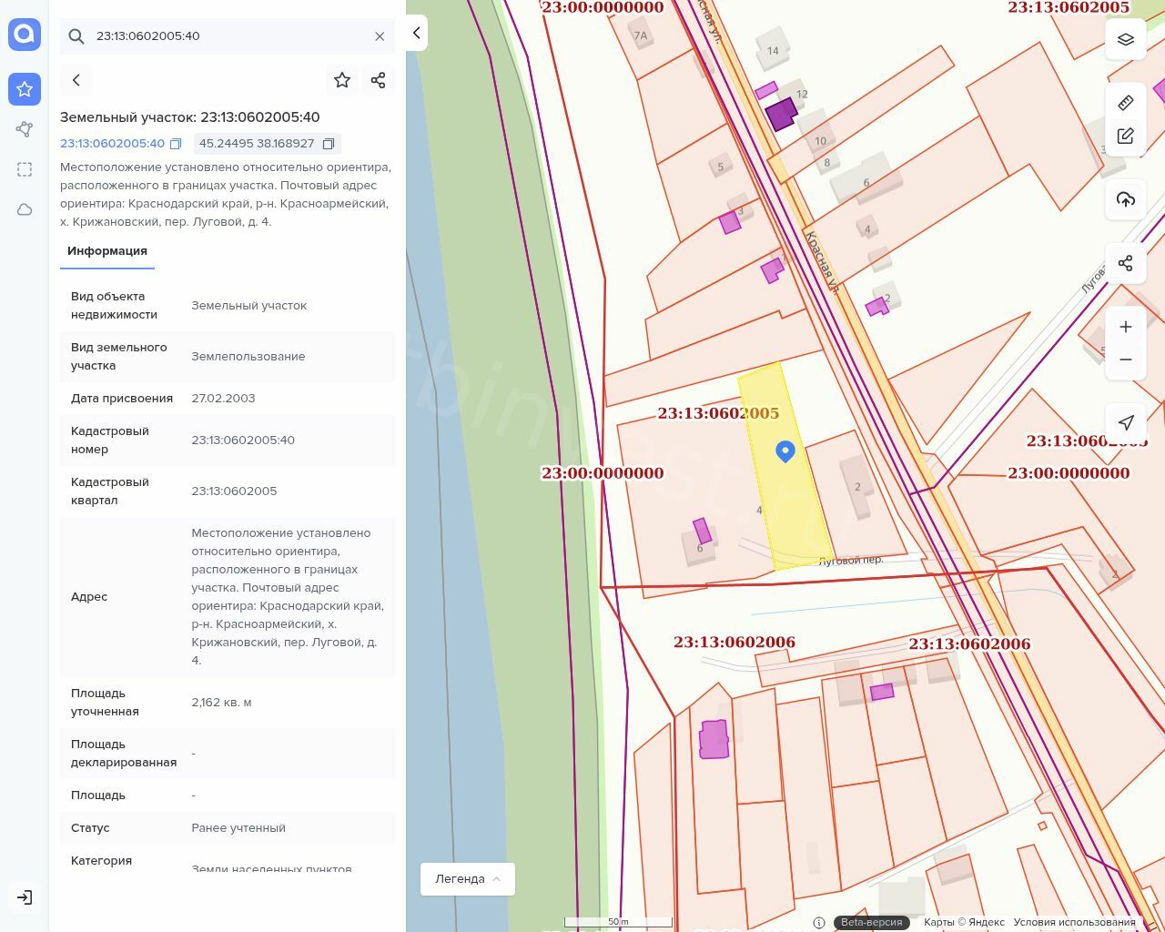 Земельный участок 2162 кв.м, категория земель ИЖС, кадастровый (условный) номер 23:13:0602005:40