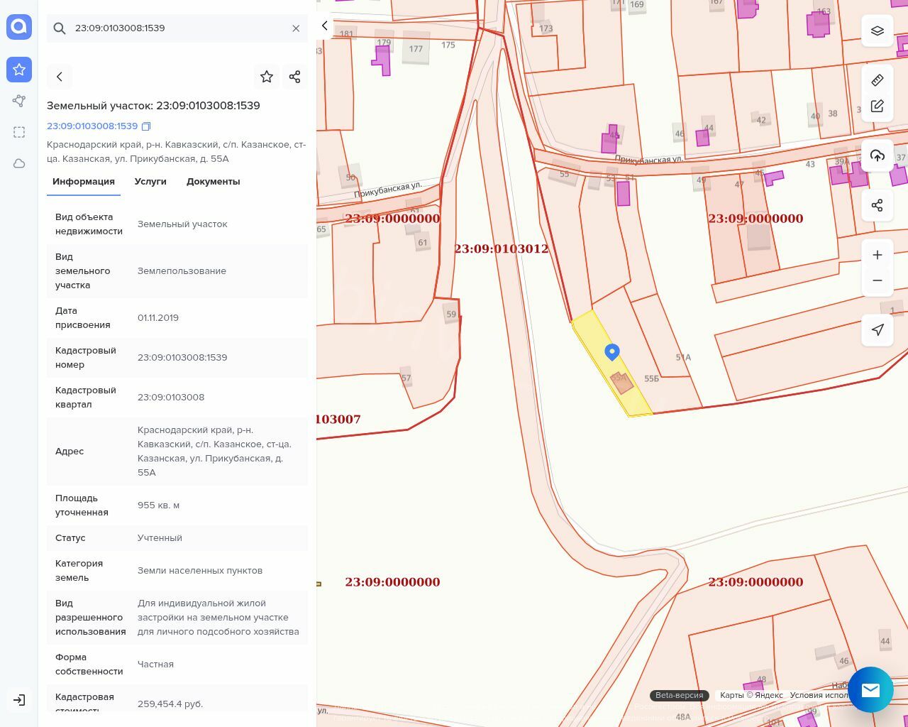 Земельный участок, размер земельного участка 955 кв.м, категория земель: земли населенных пунктов. Разрешенное использование для объектов жилой застройки, кадастровый номер 23:09:0103008:1539