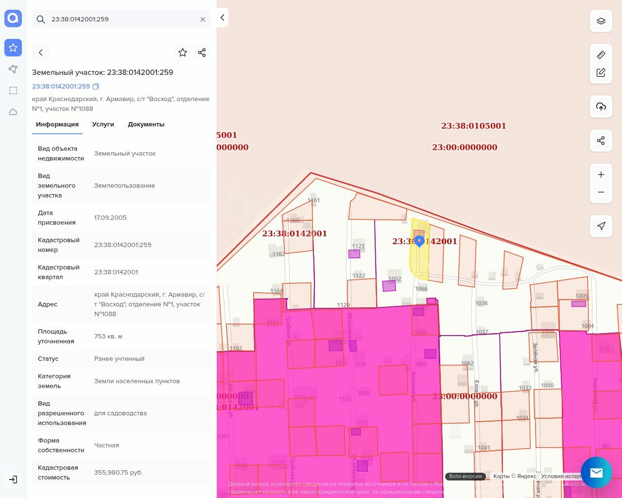 Земельный участок площадью 753 +/- 19 кв. м, категория земель: земли населенных пунктов, разрешенное использование: для садоводства, с кадастровым номером: 23:38:0142001:259;