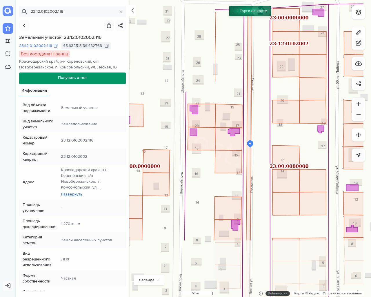 Земельный участок, ЛПХ, площадью 1270 кв.м, кадастровый № 23:12:0102002:116