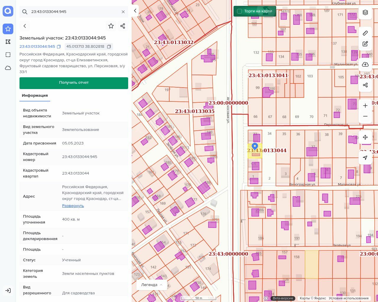 Земельный участок, площадью 400,0 кв. метров, имеющий кадастровый номер 23:43:0133044:945, категория земель «Земли населенных пунктов», разрешенное использование «Для садоводства» («Земельный участок»);