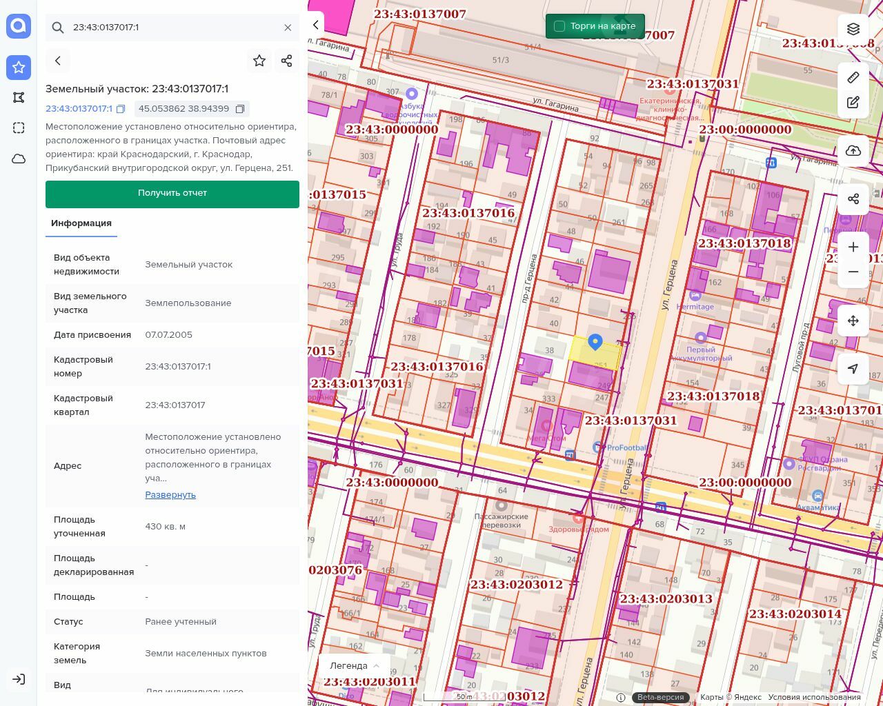 Земельный участок с КН 2 23:43:0137017:1, общей площадью 430 +/- 7кв. м.