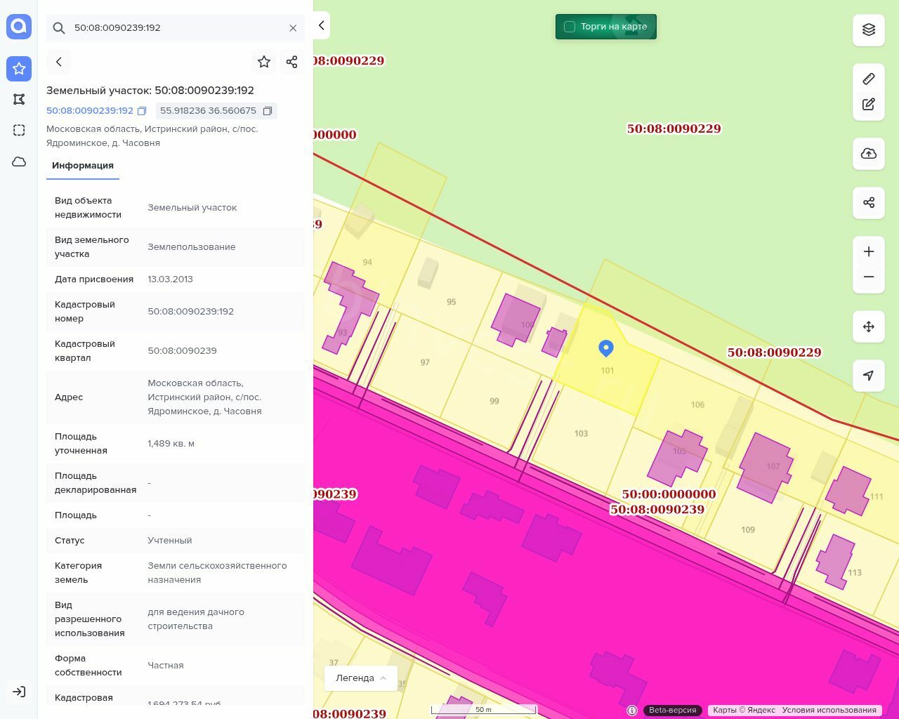 Земельный участок с кадастровым номером 50:08:0090239:192, общей площадью 1 489 кв. м, виды разрешенного использования: для ведения дачного строительства, категория земель: земли сельскохозяйственного назначения,