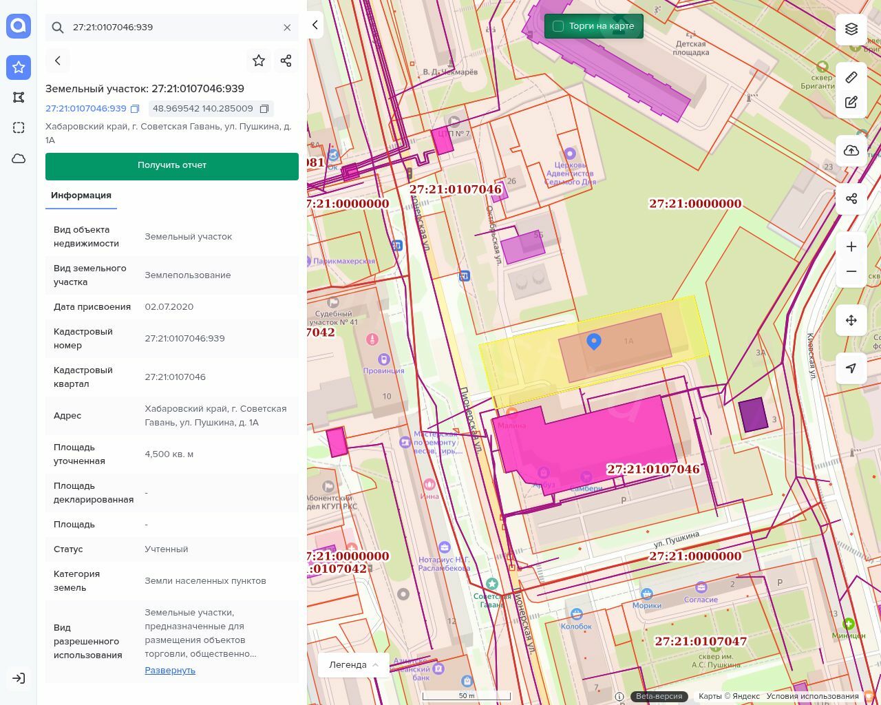 Земельный участок, категория земель - земли населенных пунктов, вид разрешенного использования: земельные участки, предназначенные для размещения объектов торговли, общественного питания и бытового обслуживания; для размещения объектов торговли, общая площадь 4500 кв.м., кадастровый номер 27:21:0107046:939