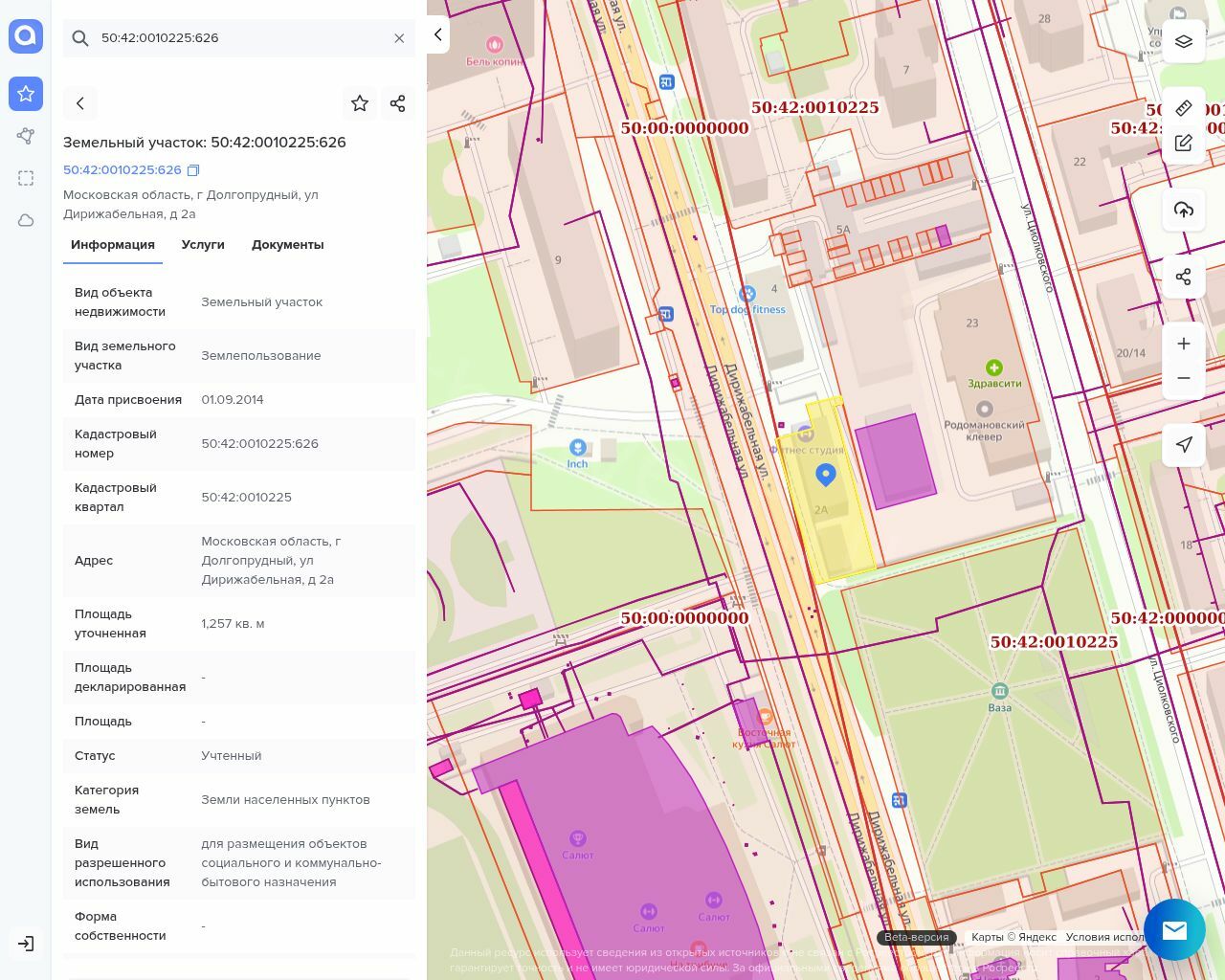 1.3. Земельный участок, кад. № 50:42:0010225:626, общей площадью 1 257 кв.м, категория: земли населённых пунктов. Адрес: Московская обл., г. Долгопрудный, ул. Дирижабельная, д.2а