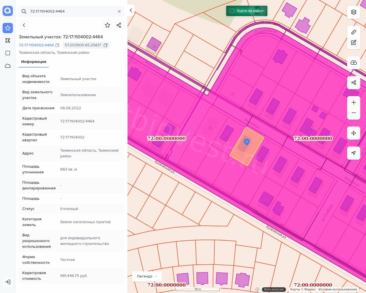 Жилой дом общей площадью 116,4 кв.м., кол-во этажей: 1, кадастровый номер: 72:17:1104002:5586, вид объекта недвижимости: Здание, с земельным участком площадью 863,0 кв. м., Кадастровый номер: 72:17:1104002:4464, Назначение объекта недвижимости: данные отсутствуют, Виды разрешенного использования объекта недвижимости: для индивидуального жилищного строительства