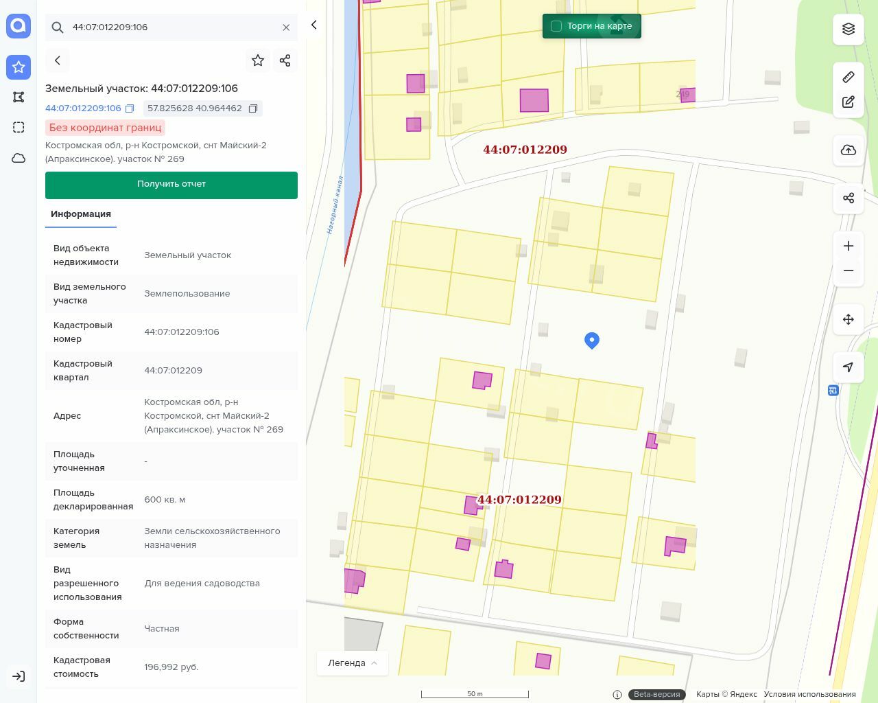 Земельный участок, категория земель: Земли сельскохозяйственного назначения, разрешенное использование: Для ведения садоводства, общая площадь 600 кв. м., кадастровый номер 44:07:012209:106