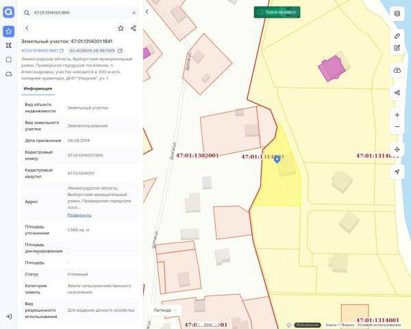Земельный участок площадью 1 986 кв. м, кад. №47:01:1314001:1841,