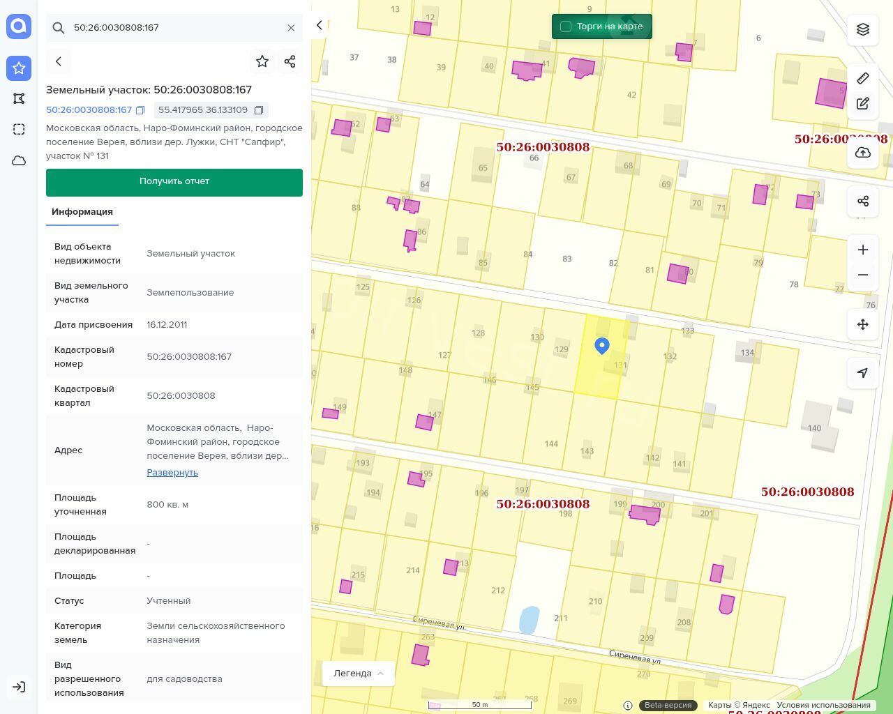 Земельный участок: кадастровый номер: 50:26:0030808:167 Назначение объекта недвижимости: данные отсутствуют Виды разрешенного использования объекта недвижимости: для садоводства. площадь: 800 +/- 20