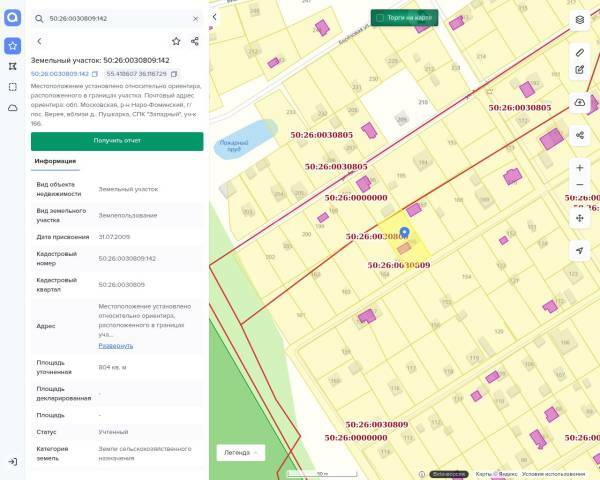 Земельный участок, назначение: сельскохозяйственное, общей площадью 804 м2, кадастровый (условный) номер: 50:26:0030809:142