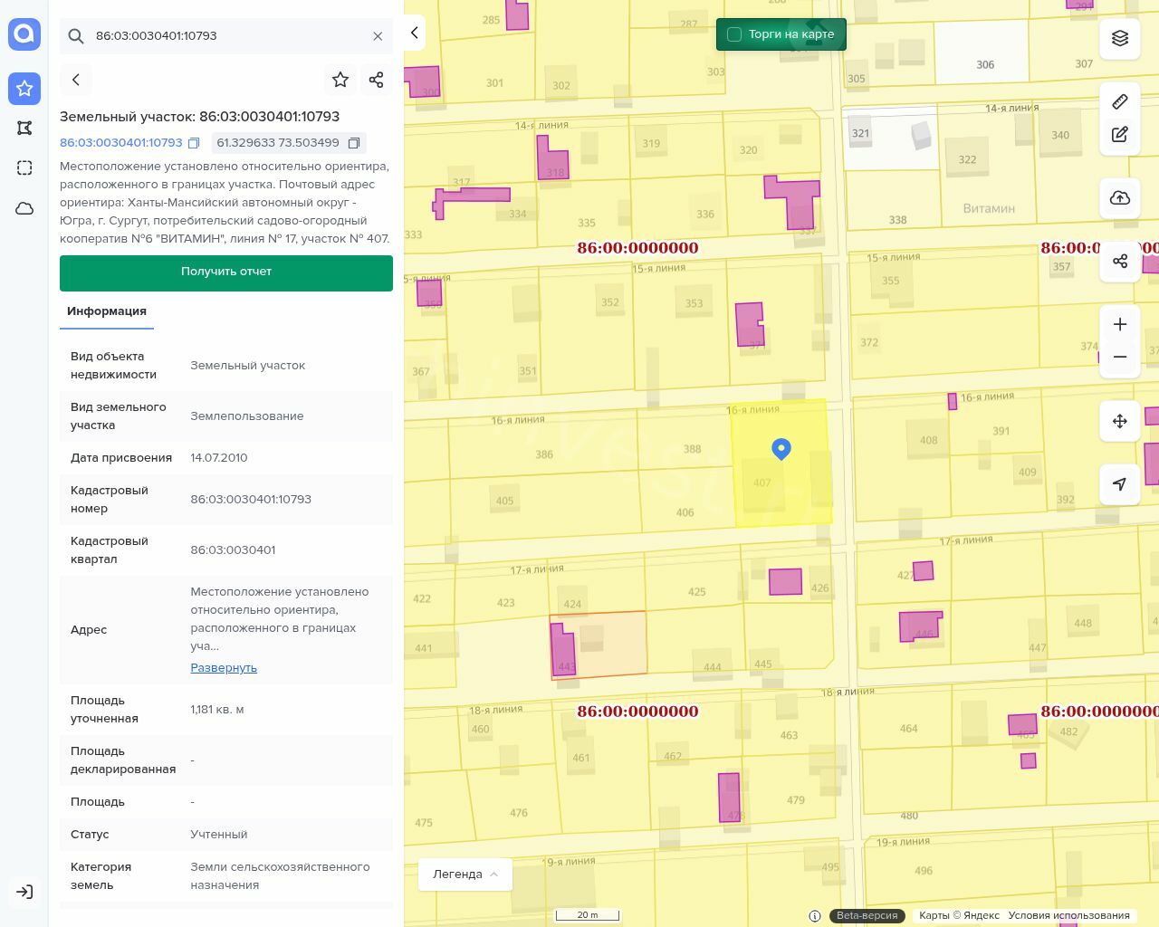 Адрес: местоположение: установлено относительно ориентира, расположенного в границах участка. Почтовый адрес ориентира: Ханты-Мансийский автономный округ - Югра, г. Сургут, потребительский садово-огородный кооператив №6 "ВИТАМИН", линия № 17, участок № 407;