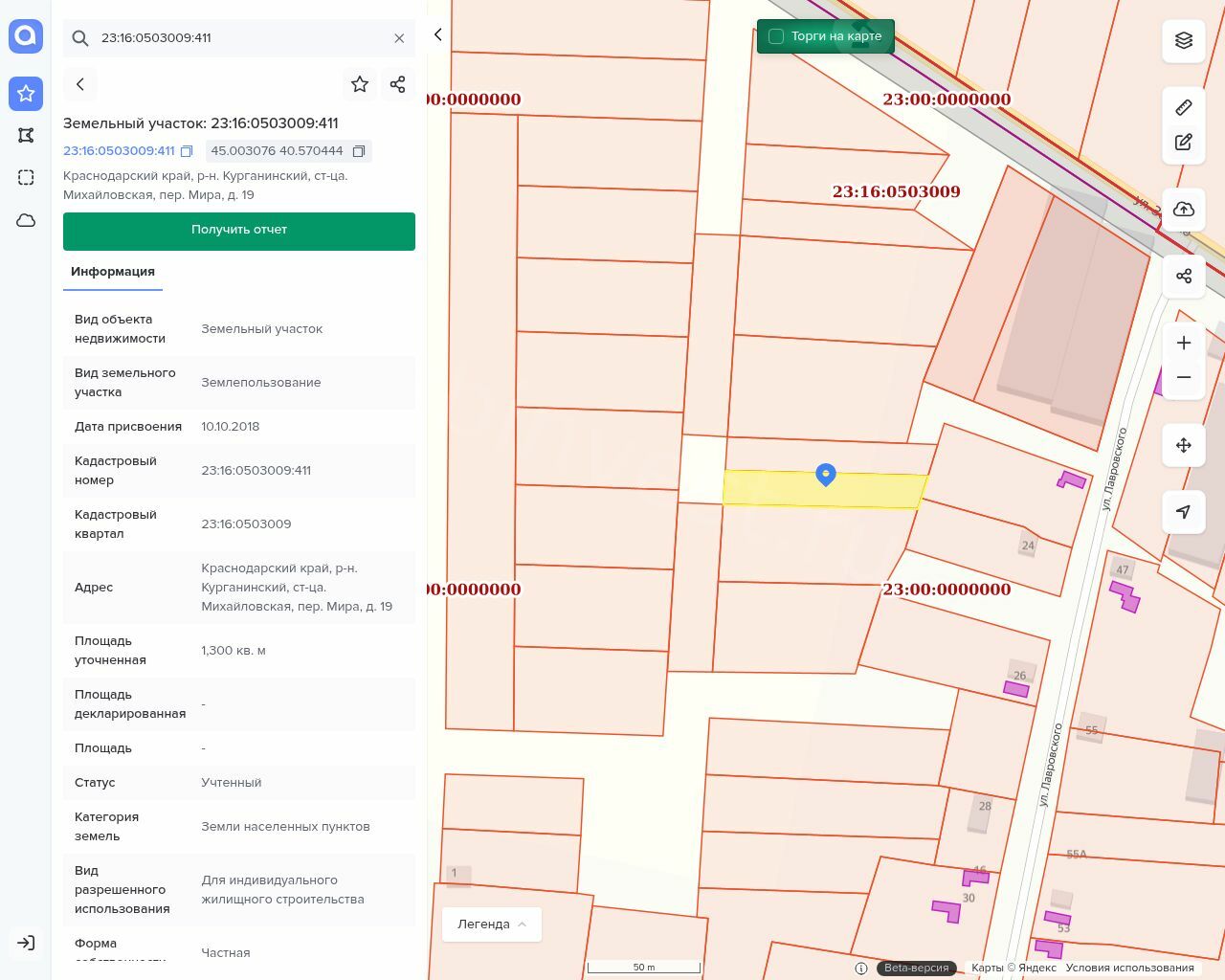Земельный участок, общей площадью 1 300 кв.м. ,кадастровый (условный) номер: 23:16:0503009:411